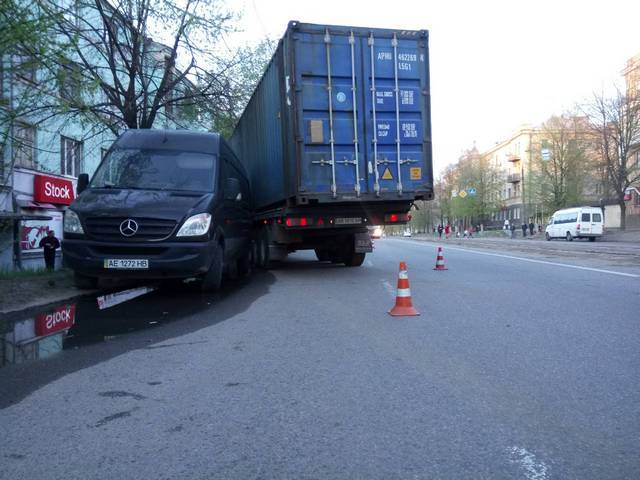 18 апреля, около 18:45 на проспекте Мазепы, 42 (бывший проспект Петровского) водитель фуры не справился с управлением и вылетел на встречную полосу движения, столкнувшись с Mersedes Sprinter.