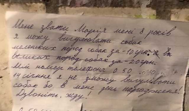Об этом в "Фейсбуке" сообщает Дмитрий Легеза, передает Depo.Днепр."Меня зовут Мария, мне 8 лет. Я могу выгуливать собак маленьких пород за 10 грн. Мой номер телефона... 14 января я не смогу выгуливать собак, потому что у меня день рождения! Звоните, жду!", - говорится в объявлении.В комментариях пользователи соцсети отмечают, что девочке необходимо быть осмотрительной и не заходить в квартиры к незнакомым людям. И советуют забирать собак у подъездов.