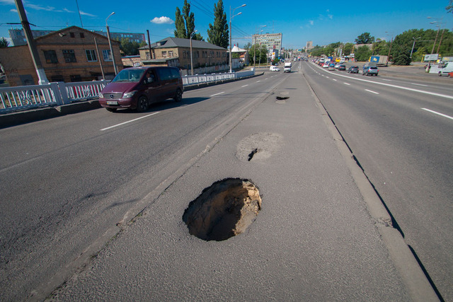 Ни для кого не секрет, что виадук рушится и рушится уже достаточно давно. Не раз здесь случались обвалы, в результате которых чудом не пострадали автомобили. Проезжая часть на Слобожанском проспекте более-менее вменяемая, однако состояние пешеходных дорожек и опор моста могло бы послужить вдохновением для новой части «Пункта назначения». Местами на тротуаре проваливается асфальт, да так, что можно разглядеть проезжающие под ним автомобили. Опоры, как и ступеньки возле съездов с виадука, крошатся в буквальном смысле этого слова, а в заброшенной постройке, которая стала излюбленным местом отдельной касты населения, не раз случались пожары. Со стороны создается впечатление, что во всем, что происходит на виадуке, нет ничего страшного. Но, по факту, эти мелкие «проколы» в скором времени могут привести к травмам разной степени тяжести и аналогичным дорожно-транспортным происшествиям.