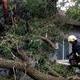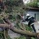 Сотрудники ГСЧС с помощью бензопилы распилили дерево на части и убрали его с крыши дома.