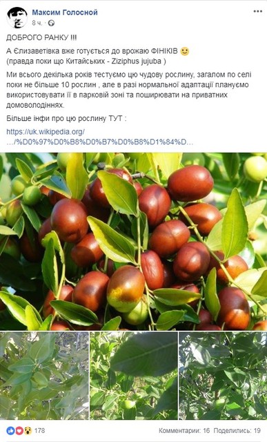 Об этом сообщает глава сельского совета Елизаветовки Максим Голосной.«А Єлизаветівка вже готується до врожаю ФІНІКІВ. Правда поки що Китайських - Ziziphus jujuba. Ми всього декілька років тестуємо цю чудову рослину, загалом по селі поки не більше 10 рослин, але в разі нормальної адаптації плануємо використовувати її в парковій зоні та поширювати на приватних домоволодіннях.» - написал Максим Голосной.