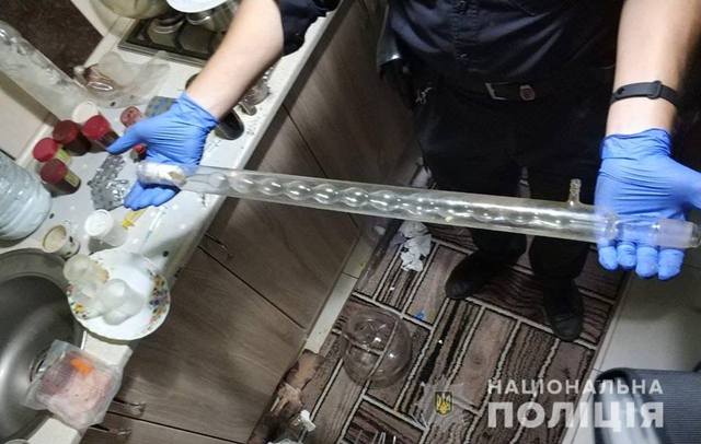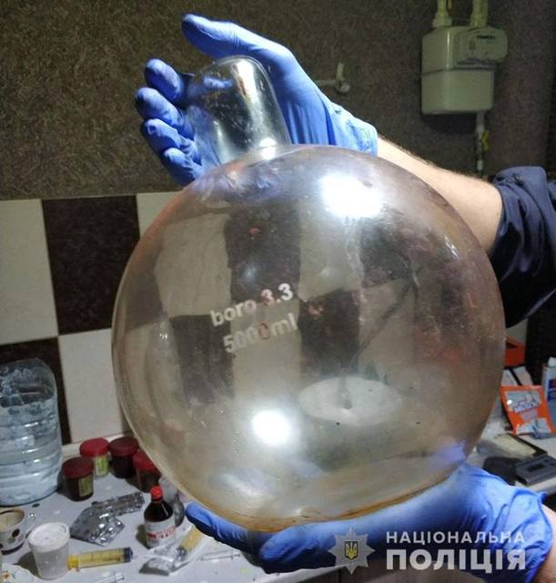 Крім цього, з приміщення вилучили лабораторний посуд та обладнання зі слідами виготовлення психотропної речовини. Всі вилучені предмети направлені на експертизу.
