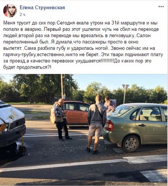 «Меня трусит до сих пор. Сегодня ехала утром на 31-й маршрутке и мы попали в аварию. Первый раз этот ушлеп@к чуть не сбил на переходе людей, второй раз на переходе мы врезались в легковушку. Салон переполненный был. Я думала, что пассажиры просто в окно вылетят. Сама разбила губу и ударилась ногой. Звоню сейчас им на «гарячку» — трубку, естественно, никто не берет. Эти тв@ри поднимают плату за проезд, а качество перевозок ухудшается! До каких пор это будет продолжаться?!», — пишет Елена.Как рассказал председатель профсоюза автомобилистов и автоперевозчиков Днепра Михаил Тонконогий, предварительно, причиной ДТП стало то, что водитель не выдержал дистанцию.