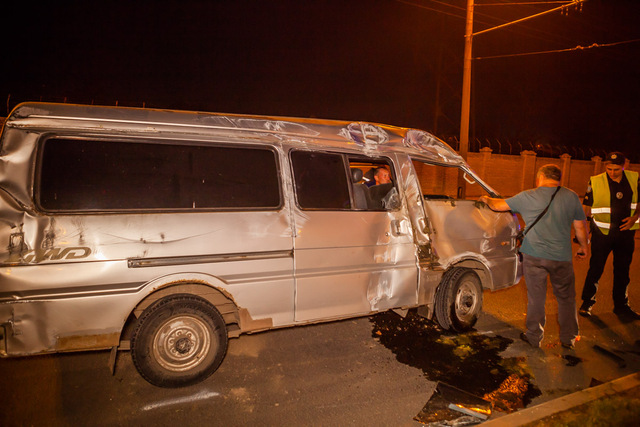 В машине от удара треснуло и вылетело лобовое стекло. В результате происшествия водитель не пострадал. Медики, осмотрев на месте мужчину, не нашли у него никаких повреждений. Предварительно, по словам патрульных, водитель находился в трезвом состоянии. Около 21:00 на место приехали спасатели, чтобы поставить микроавтобус на место.