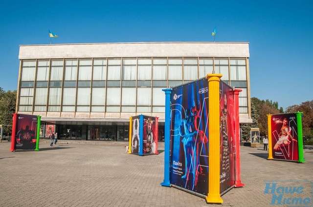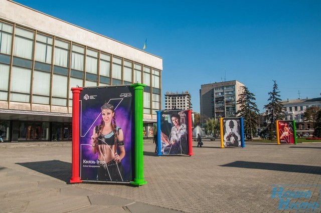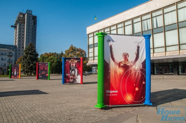 Необычные конструкции с натянутыми фотографиями и объявлениями о предстоящих спектаклях. Цветные, треугольные, высотой с человека — афиши возле Оперного театра хорошо видны с противоположной стороны проспекта Яворницкого. Яркие цвета и огромные плакаты привлекают внимание прохожих.