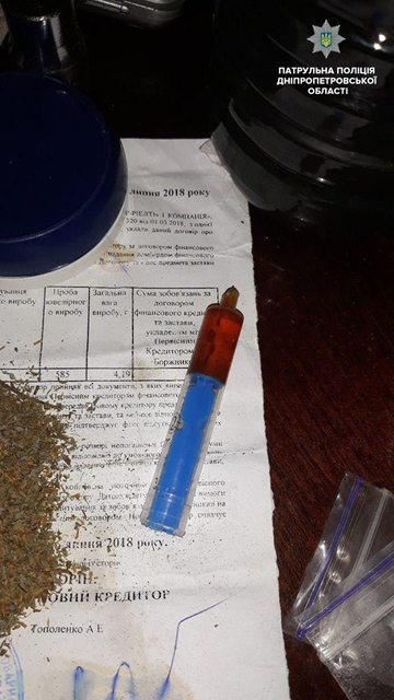 Рядом с ним лежали ножи, дубинка с гвоздями, на столе - коробка, в которой были 8 патронов, а также устройство для употребления наркотических веществ. Также патрульные увидели бумажные свертки с растительным веществом, похожим на наркотическое, слип-пакеты с запрещенными веществами и несколько шприцев с ними. На место происшествия инспекторы вызвали следственно-оперативную группу и доставили гражданина в Амур-Нижнеднепровское отделение полиции.