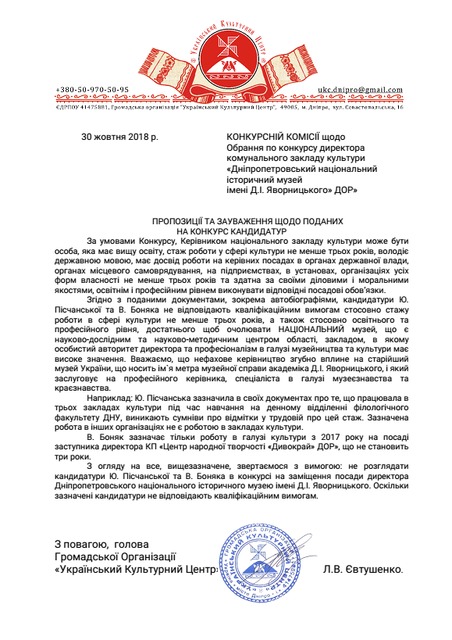 «Нам стало известно, что данные некоторых кандидатов на эту должность не соответствуют требованиям конкурса. В частности, в соответствии с поданными документами (в том числе автобиографиями) кандидатуры Ю.Песчанской и В.Боняка не соответствуют квалификационным требованиям относительно стажа работы в сфере культуры не менее трех лет, а также относительно образовательного и профессионального уровня, достаточных для того, чтобы возглавить Национальный музей.Городской сайт будет следить за развитием этой ситуации.В итоге мы направили возражения в конкурсную комиссию по этим кандидатурам.
