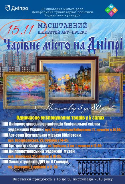 Арт-проект «Чарівне місто на Дніпрі» напоминает художественный марафон, своеобразное путешествие от музея к музею. В различных выставочных залах будут представлены работы, посвященные пейзажам Днепра, архитектурные и графические рисунки, творческие фантазии на тему «Город, в котором я живу, мечтаю, творю».