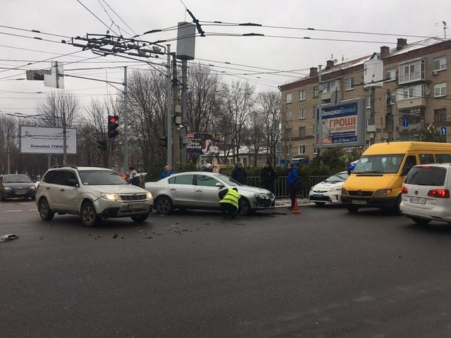 Как рассказала пассажир Volkswagen, их автомобиль поворачивал с проспекта Поля на улицу Титова на зеленый сигнал светофора. В это время Renault ехал по улице Титова со стороны проспекта Богдана Хмельницкого. На перекрестке автомобили столкнулись.По словам водителя Renault, в то время на перекрестке с его стороны не работал светофор и поэтому автомобиль продолжил движение. Мужчина не считает себя виновным в ДТП, по его словам, он двигался по главной дороге.