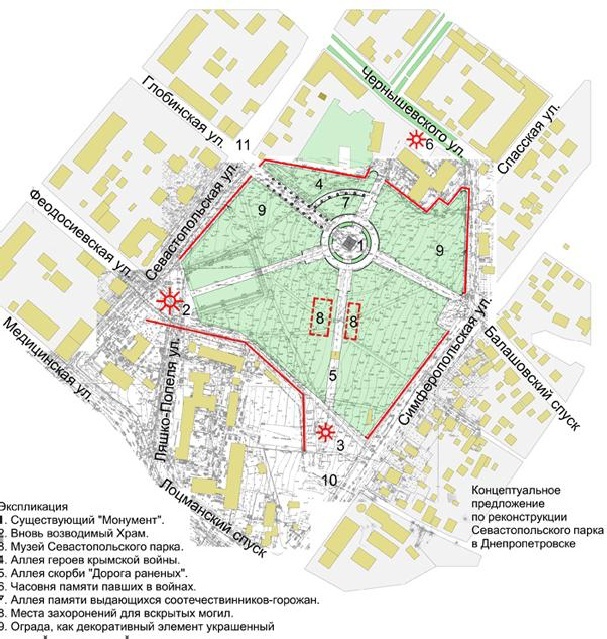 «Сучасна територія Севастопольського парку в м. Дніпро на цей час позбавлена своєї первинної історії. Ціла епоха викреслена з її контексту, рештки численних доль і досі позбавлені головних інструментів територіального захисту. Зараз це просто меморіальний парк, де важко віднайти і відокремити колишню структуру, колишні складові. Внаслідок навмисного нівелювання культової складової комплексуісторичного цвинтаря утворилася тимчасова порожнина сакрального розуміння існуючої ділянки, яка залишається і сьогодні. Більш того, внаслідок інформаційних прогалин виникає загроза некоректного використання даної території під час створення нових об’єктів, потреба в яких рано чи пізно виникає в ході активізації релігійний процесів сучасного суспільства.Еще одна огромная, по мнению Александра Харлана, проблема – отсутствие полноценных археологических изысканий на территории Севастопольского парка. Это не дает возможность установить место нахождения остатков фундамента церкви (по основной версии историков, она находилась на том месте, где после войны был насыпан мемориальный курган) и могил выдающихся жителей Екатеринослава, в том числе – Александра Поля.В занедбаному стані знаходиться низка об’єктів парку, окремі важливі складові зникли (надгробки мешканців Катеринослава-Дніпропетровська,Лазаревська церква, каплиця військового кладовища, пропілеї головного входу). Існує потреба в реконструкції парку. Брак коштів не дає можливості її проведення».