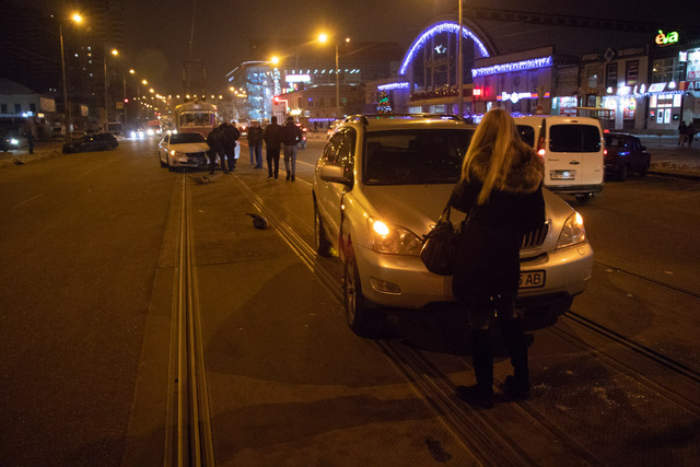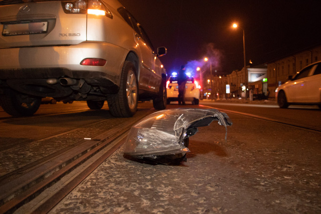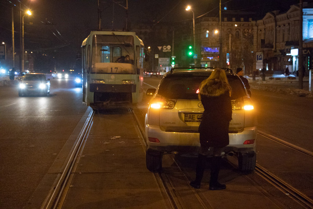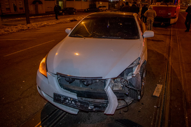 Предварительно известно, что Lexus ехал со стороны проспекта Пушкина к проспекту Яворницкого по трамвайным путям, рядом ехала Toyota.Как именно произошла авария объяснить обе стороны так и не смогли: водитель Toyota утверждала, что она ехала прямо, а второй участник аварии утверждал, что либо она пыталась объехать ливневку, либо шла на разворот, в результате чего и ударила Lexus в бок.