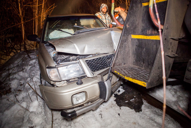 2 февраля на улице Маяковского, возле «ДЗМО», тепловоз снес Subaru. Поезд протащил авто несколько десятков метров.
