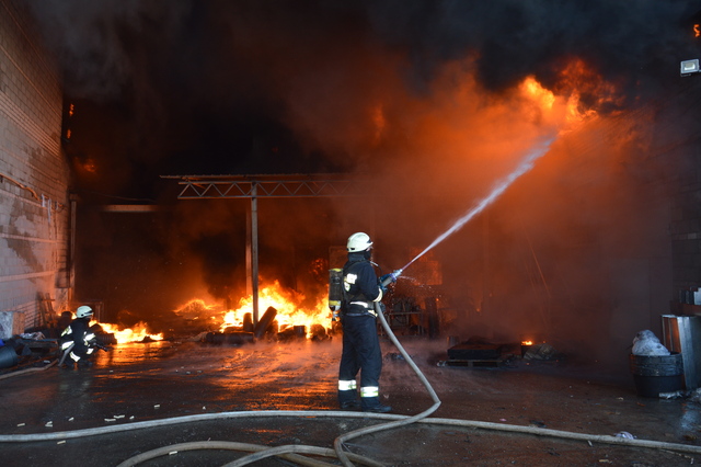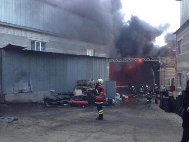 Горят производственные бытовые помещения ангарного типа предприятия по изготовлению пластиковых изделий.Сложность тушения заключалась в большой горючей нагрузке в ангарах, а именно пластиковое сырье, оборудование и готовая пластиковая продукция.