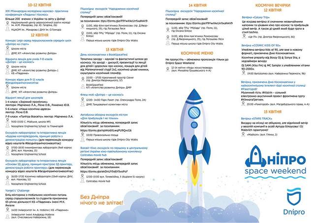 В течение 12-14 апреля 2019 в Днепре будет проходить масштабное городское мероприятие - Dnipro Space Weekend (Космические выходные в Днепре), организатором которого выступило Агентство развития Днепра при поддержке Департамента гуманитарной политики Днепровской городского совета.
