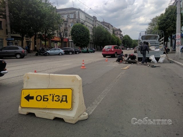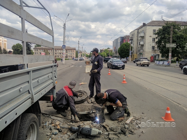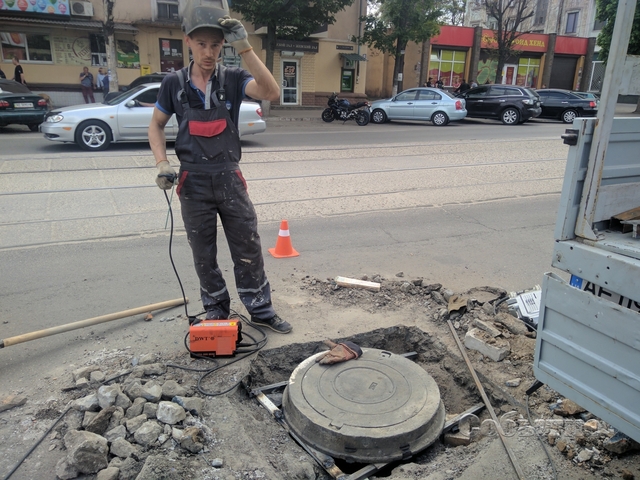 Аналогичные работы 7 мая проводились по проспекту Шевченко возле здания Центральной библиотеки. Рабочие вырезали кусок дорожного покрытия вокруг покосившегося люка канализационного колодца, в котором была нарушена кладка. Люк закрепили с помощью металлической рамы с применением сварочных работ. По словам рабочих, коммуникаций, нуждающихся в подобном ремонте, в городе множество.