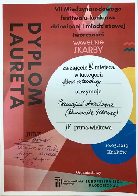Студентка Каменского музыкального колледжа Анастасия Шарапат (преподаватель Галина Анжела Николаевна) приняла участие в VII Международном фестивале-конкурсе «Вавельские сокровища», который проходил в польском Кракове с 9 по 12 мая.