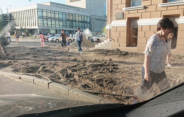 «КП «Благоустрій міста» переукладывает тротуарное покрытие на углу пр. Яворницкого и ул. Юлиуша Словацкого.Состояние старого тротуара было ужасное, полосами переукладывать не получается, извините, только целиком. До конца недели обещаем закончить, потерпите, пожалуйста, неудобства пару дней».