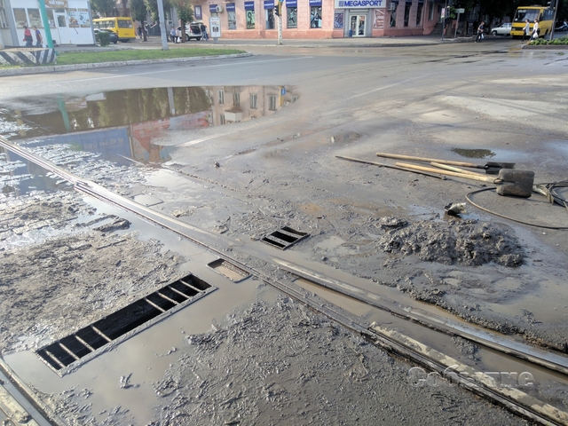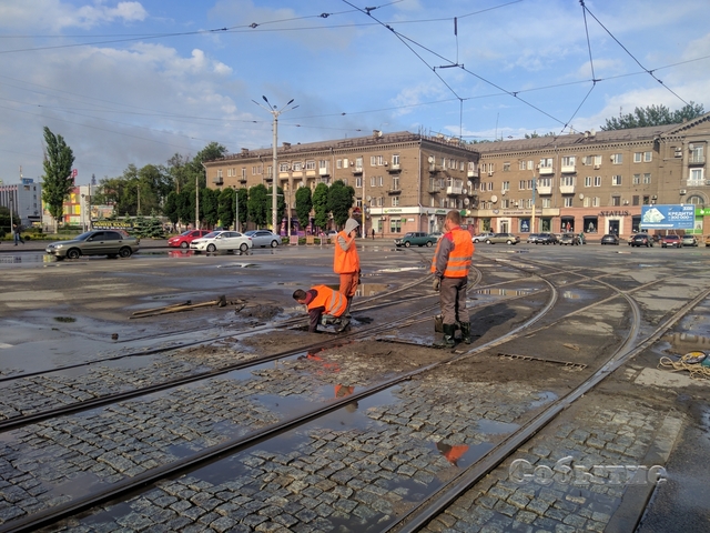 Около 17.30 22 мая рабочие в оранжевых жилетах прочищают сточный колодец в сердце города - на Майдане Героев.