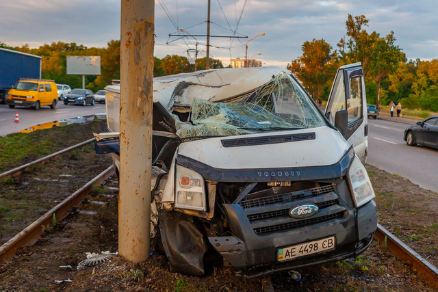 В воскресенье, 26 мая, около 19:30, на Кайдакском мосту случилось ДТП. Ford вылетел на рельсы и врезался в столб.