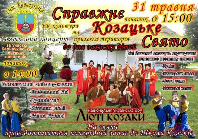 В пятницу, 31 мая, в Доме культуры и на прилегающей к нему территории в поселке Карнауховка состоится праздничный концерт «Справжнє козацьке свято», приуроченный ко Дню защиты детей.