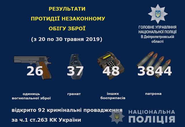 По ч.1 ст. 263 Уголовного кодекса Украины открыто 92 уголовных производства, 14 виновным лицам сообщено о подозрении за незаконное обращение с оружием, боевыми припасами или взрывчатыми веществами. За указанное преступление злоумышленникам грозит от 3-х до 7 лет лишения свободы.Так, 29 мая полицейские задержали 34-летнего местного жителя, который пытался продать обрез гладкоствольного охотничьего ружья 16-го калибра. В этот же день во время обыска по месту его проживания был изъят корпус от гранаты и 7 патронов 16 калибра.