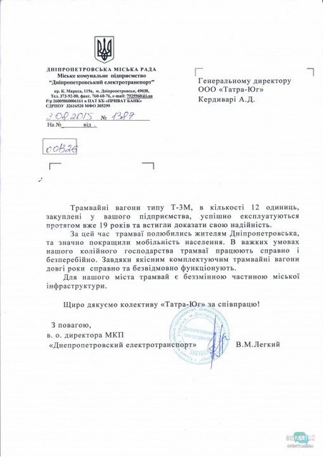 «Распространенная заместителем городского головы города Днепр, директором департамента благоустройства и инфраструктуры Михаилом Лысенко информация является недостоверной и негативной, нарушает личные неимущественные права ООО «Татра-Юг» и нашу деловую репутацию.В качестве доказательства ложной информации направляем Вам в приложении к данному письму отзывы эксплуатирующих организаций из городов Днепр, Николаев, Одесса, Мариуполь и Запорожье, в которых указано, сколько произведенных вагонов «Татра-Юг» эксплуатирует город и результаты их успешной работы. Относительно проекта в Египте сообщаем, что произведено уже 5 трамвайных вагонов согласно контракту.