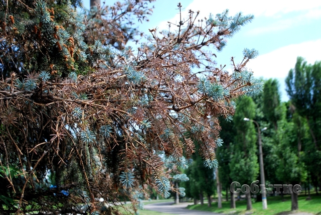 На проспекте Стуса пропадают хвойные деревья. Иголки на них сначала меняют цвет. Потом становятся сухими и опадают.