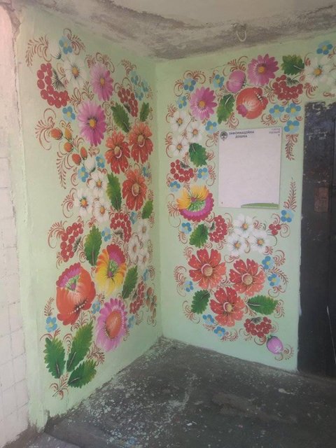 На левобережье Каменского один из подъездов дома по проспекту Победы, 14, художница Александра Демиденко разрисовала в Петриковскую роспись.