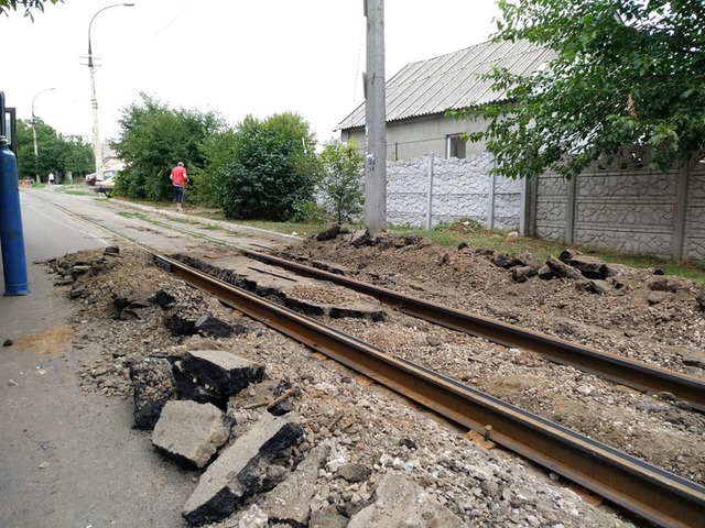 Новыми трамвайными рельсами заменили железнодорожные, которые прежде были частично уложены на этом участке. Заменили 8 звеньев рельс или 100 метров пути.