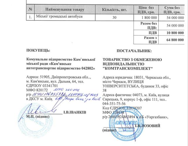 Сегодня, 23 августа, между КАТП 042802 и ООО «Комтранскомплект» (г. Черкассы) был подписан договор на 64 млн 800 тысяч гривен. Предмет покупки – 30 новых автобусов, стоимостью 1 млн 800 тыс. гривен (без НДС) или 2 млн 160 тыс. гривен (с НДС) за единицу.