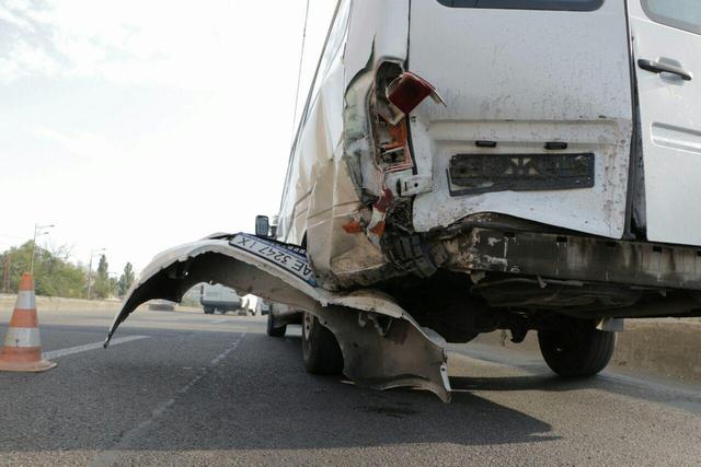 После столкновения у Fiat практически не осталось передней части кузова: капот авто полностью смят, лобовое стекло разбито, а осколки бампера лежат на проезжей части. У маршрутки повреждена лишь левая часть заднего бампера, а также немного смят кузов.