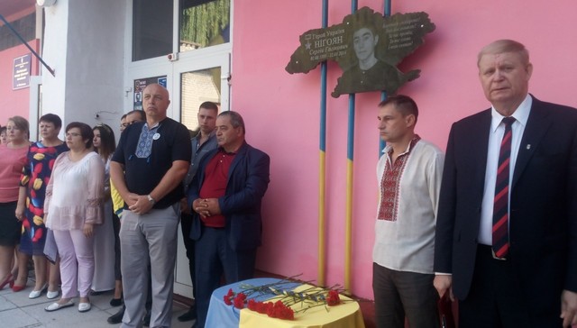 Доску памяти открывали отец Сергея, Гагик Нигоян, секретарь Каменского городского совета Александр Залевский и председатель организации «Семья Героя» Александр Самойлович.