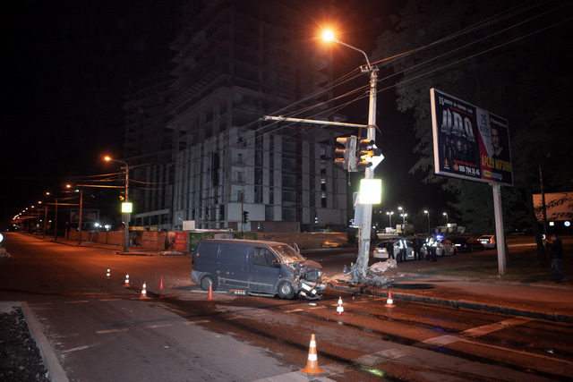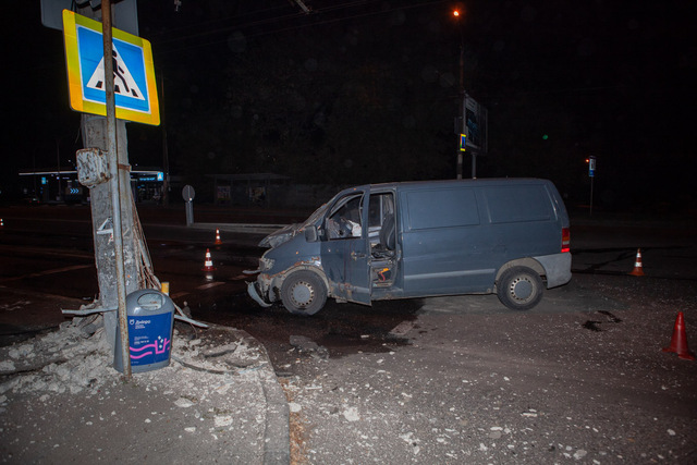 Во вторник, 10 сентября, в 3:30 на перекрестке улиц Генерала Пушкина и Запорожского шоссе Mercedes Vito «влетел» в светофорный столб, опора повисла на проводах. Водителя микроавтобуса госпитализировали.