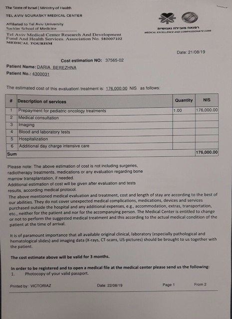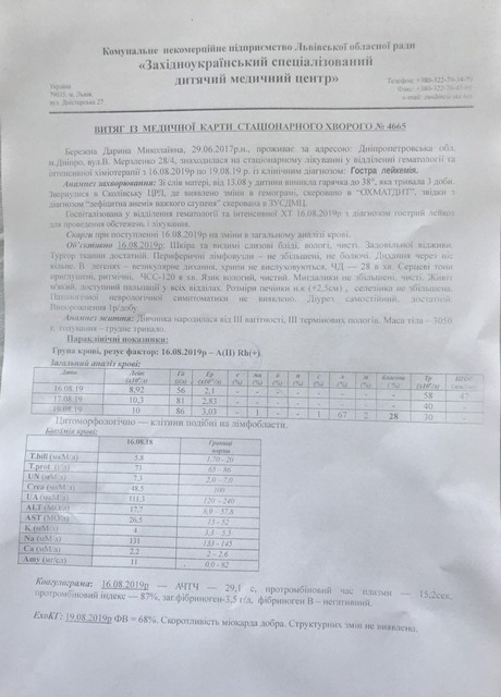 Однажды у девочки поднялась температура. Сдали анализы. В середине августа родители Даши услышали от гематологов угрожающий диагноз - острый лейкоз. Ребенка уже начали лечить в израильской клинике. Чтобы пройти весь курс лечения и реабилитации, необходимо около 180 тысяч долларов. Для родителей маленькой Даши сумма неподъемная. Поэтому обращаются ко всем неравнодушным с просьбой помочь.