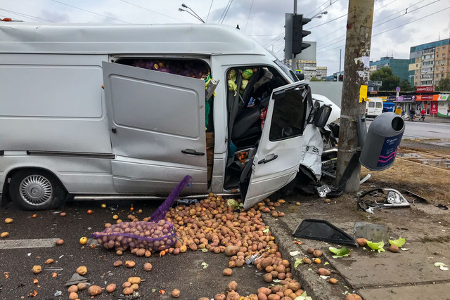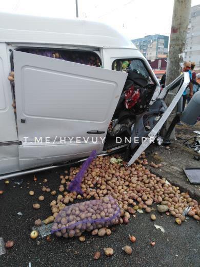 Наряд полиции уже на месте, контролируют обстановку на дороге. Из-за аварии образовалась большая пробка — проездной левый ряд в сторону Кайдакского моста. Кроме этого, по дороге разбросаны овощи, которые находились в Mercedes Sprinter, что также затрудняет движение. Будьте внимательными.