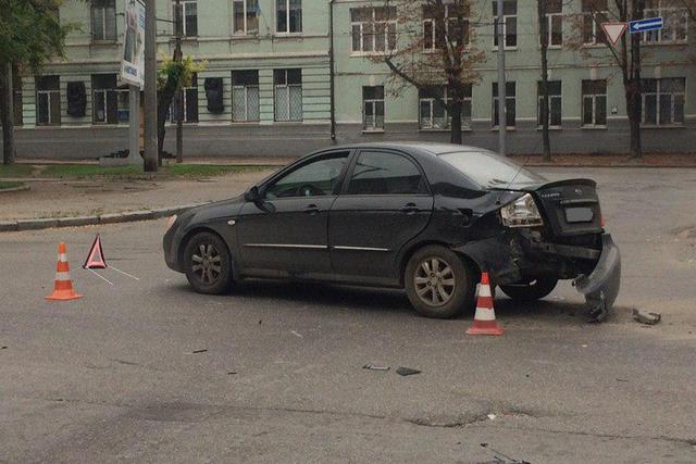 По предварительной версии, KIA двигалось по спуску Калинина и не уступила дорогу BMW. В результате автомобили столкнулись.У KIA разбит задний бампер. Машину выбросило на середину перекрёстка, что создало препятствие для движения. У BMW X5 серьезные повреждения на левой фаре. Автомобиль откинуло на несколько метров по проспекту Пушкина. Никто из участников аварии за помощью к медикам не обращался.