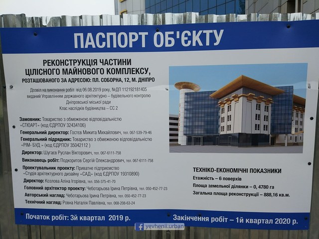 «Проводится реконструкция SPA-комплекса «Цунами», площадь Соборная 12.Действительно, этот проект рассматривался на градсовете Днепра, о чем писал Городской сайт.На первом этаже комплекса появится ресторан на 100 мест, в подвальном помещении бар на 50 посетителей, гардеробные, кухня ресторана и другие помещения с пристройкой входа и лестницы, ведущей в подвал. На первом этаже также планируется лобби-бар отеля на 10 мест.