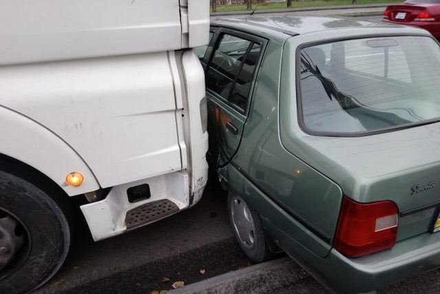 В пятницу, 8 ноября, в Днепре на съезде с Кайдакского моста произошло ДТП с участием фуры и легковушки. Тяжелогруз МАN столкнулся с «Таврией» и прижал ее к столбу.