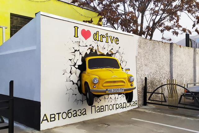 «Біля Павлоградської автобази "ДТЕК "Павлоградвугілля" відкрився креативний арт-об'єкт - жовтий горбатий Запорожець, який стирчить зі стіни з написом "I love drive".
