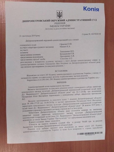 «Суд зобов'язав Дніпропетровську облраду оголосити новий КОНКУРС НА ПОСАДУ ДИРЕКТОРА Дніпропетровського національного історичного музею ім Д.І.Яворницького.