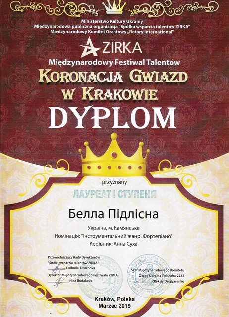 - Международный многожанровый фестиваль-конкурс «Коронация звезд 2019» г.Краков, Польша - Диплом I степени.