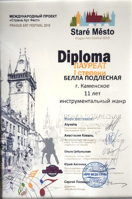 Ученица Левобережной школы искусств Белла Подлесная победила на Международном проекте «Страна Арт Фест» «Prague art festival-2019». Конкурс проходил в городе Прага, Чехия, на концертной площадке Retro Music Hall Prague.
