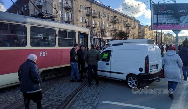 На пересечении улицы Широкой с проспектами Свободы и Шевченко автомобиль Renault Kangoo врезался в движущийся по маршруту № 3 трамвайный вагон с пассажирами.