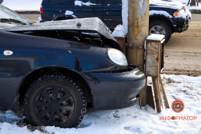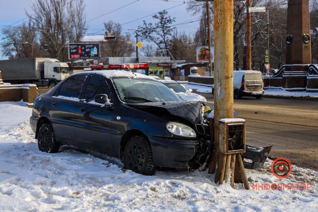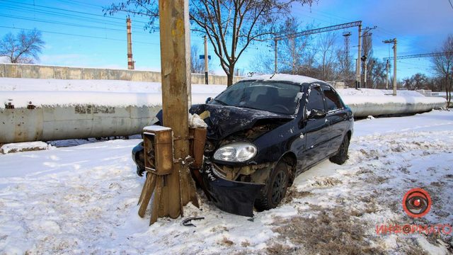 В Днепре на въезде на Амурский мост Lanos влетел в столб (видео момента ДТП)