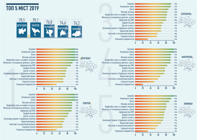 В пятерку наиболее прозрачных городов также вошли Тернополь (76,0), Мариуполь (74,6) и Винница (74,2).