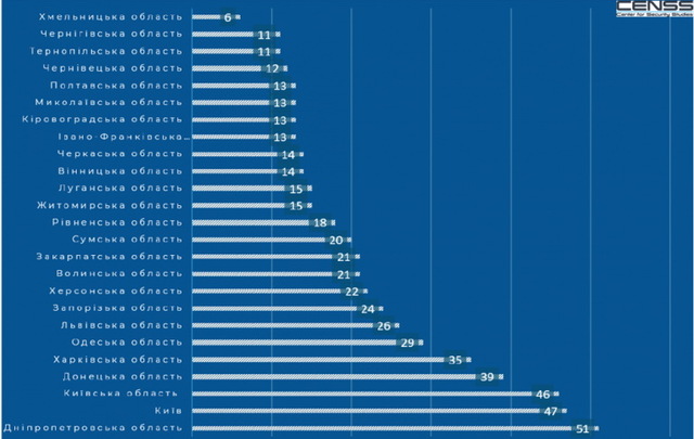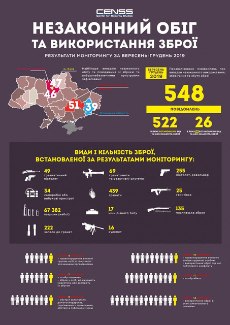 Проанализировали 548 событий, которые связаны с незаконным использованием, хранением и сбытом оружия. Результаты мониторинга показали, что из 548 «вооруженных» событий в сентябре-декабре 2019 года, зафиксировали в Днепропетровской (51), Киевской (46), Донецкой (39) областях и в Киеве (47). В Хмельницкой (6), Черниговской и Тернопольской (по 11 эпизодов), пишет 5692.
