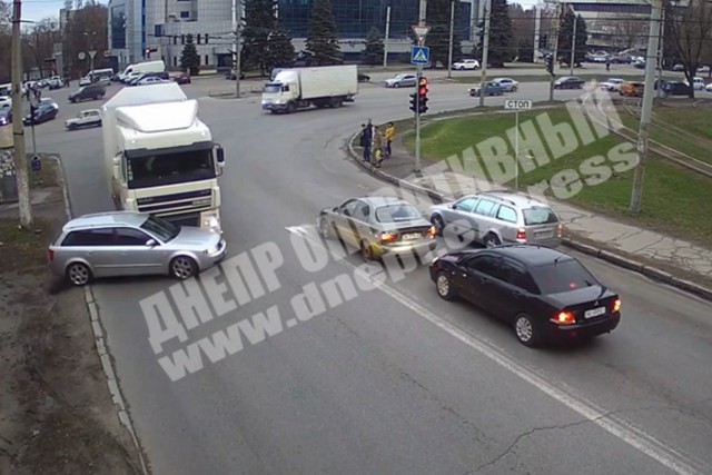Как стало известно, инцидент произошел в 17:17. Водитель легковушки поворачивал вместе с фурой на ул.Криворожскую. Водитель фуры не заметил легковушку и смял её на повороте.К счастью, в инциденте никто не пострадал. Возле поворота находилась девушка-пешеход. Она успела отскочить от автомобилей в момент ДТП.