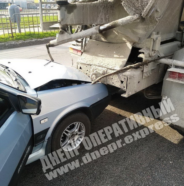 Водитель Мерседес Спринтер "догнал" ВАЗ-девятку, которая следом влетела в КАМАЗ-бетономешалку. Прибывшая на место полиция зафиксировала обстоятельства инцидента.