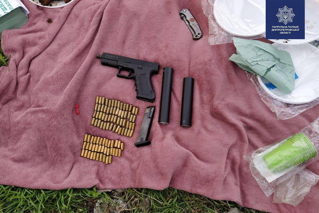 Патрульные прибыли на место происшествия и обнаружили 2 мужчин и женщину, которые устроили пикник. Общаться граждане не хотели. Один из мужчин вел себя агрессивно, нецензурно выражался в сторону патрульных. Во время поверхностной проверки у него обнаружили 2 устройства бесшумной стрельбы, пистолет, 78 патронов, а рядом металлическую банку из-под напитка со следами от выстрелов.