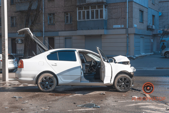 В Днепре на Жуковского столкнулись Chevrolet и Skoda: оба автомобиля вылетели на тротуар
